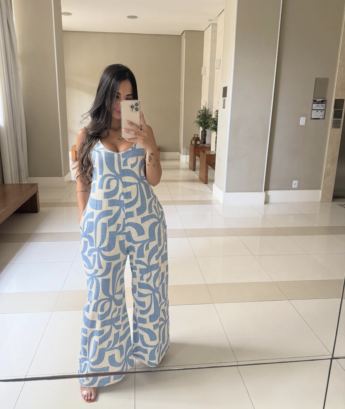 Macacão longo estampado, confeccionado em tecido leve e fluido, com modelagem ampla que garante conforto e elegância. Possui decote reto, alças largas e bolsos laterais funcionais, trazendo praticidade ao visual. A estampa geométrica em azul e branco cria um efeito moderno e sofisticado, perfeito para dias ensolarados, passeios e ocasiões casuais chic.